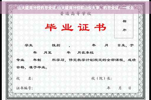 山东大学威海分校的毕业证书与山东大学毕业证书是一样的,没有区别,毕业证书上没有印威海分校字样的,其他大学分校也是一样的。山东大学威海分校学生在规定的年限内达到所在专业毕业要求者,颁发山东大学本科毕业证书;符合学校学位授予有关规定者,颁发普通高等教育本科毕业生学士学位证书。山东大学(威海)创建于1984年,是山东大学与威海市政府联合共建的多学科、开放式、综合性大学校区。她的诞生,开创了我国名校异地办学的先河;她的成长,印证了改革开放以来我国高等教育不断深化改革与科学发展的光辉历程。
