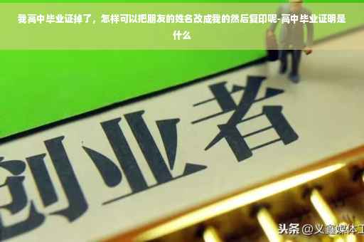 高中毕业证掉了,最好不要把朋友的姓名改成自己的, 高中毕业证书由省教育厅统一管理,省、市两级教育主管部门审查、验印,毕业证书一律于毕业当年颁发,不予补发。但教育局可以办理基础教育学校毕业证书遗失证明,具体程序如下:(1)本人到原毕业学校查核毕业证书存根或出具证明;(2)本人登报声明原证遗失作废;(3)本人持证明、报纸、照片等材料到市教育局基础教育科申报;(4)教育局核发遗失证明。 如果只是出国留学需要,到学校开具高中毕业证明及高中三年学习成绩后,再到公证处做个公证也就可以了。