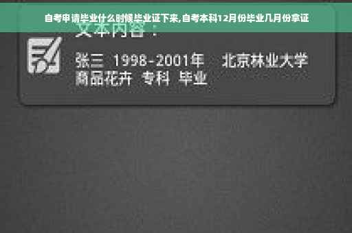 11、就好比自考成绩公布,大概3个月左右时间可以拿到毕业证书,12月份申请毕业的话,我今年6月份申请毕业的,一年能拿学历证书。