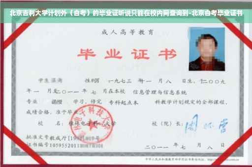 自考的,吉利发的毕业证书只能在北京吉利大学的网站查询的到,在办公室,寝室,外面上网 只要登录证书上的吉利大学自己的查询网站都能查的到,(这个证书是国家不承认的)