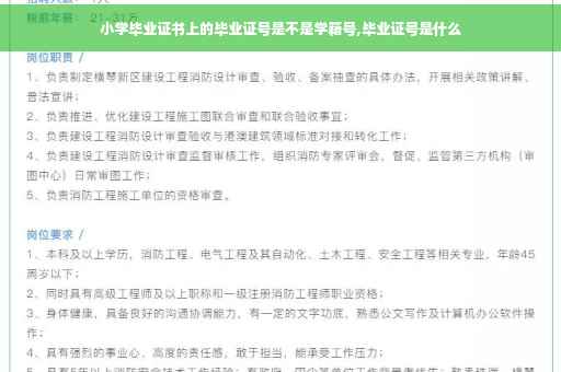 小学毕业证书上的证书编号不是是学籍号。 毕业证编号也叫电子注册号,不同的高校对于该毕业证书编号的称谓不同,有的叫做学校编号、学历证书编号、学历证编号、毕业证书号码、毕业证号码等等。只要在网上能通过姓名、毕业证编号查到毕业证信息,就能证明存在其学历。不同的高校对于该毕业证书编号的称谓不同,只要是2001年以后毕业的,都可以在毕业证书上找到一个17位或者18位的数字,这个数字就是证书编号。