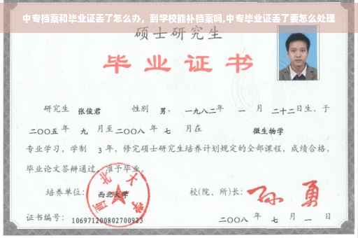 如果学生毕业证书丢失,可向学校申请办理证明,以证明该学生毕业于该校。虽然无法补办毕业证,但是该证明同样具备毕业证效力,不影响学生升学和求职。1、首先确认学生是否有中专学籍,入学后由教务处到地市级教育局注册学籍;2、中专学制有三种:国办中专有初中三年制、高中一年制,民办中专(职业中专)一般为两年;3、到毕业的最后一学期由学校统一采集学生办毕业证的电子照片(二寸蓝底),统一造册(毕业证发放花名册),连同打印好的毕业证内芯(有查询网址)送教育局验印;4、如果毕业证丢失,可以到原毕业学校教务处(学籍办)查询学生的毕业证编号和学号(外地可以打电话)。5、2000年以后发的中专毕业证都可以在省市教育信息网上查到。6、到学校办理相关证明。
