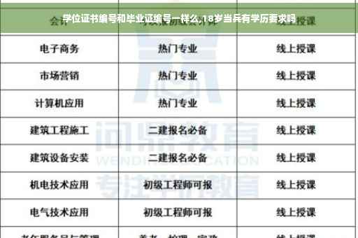 不一样的。 1)毕(结)业证书编号即为注册号,使用阿拉伯数字,统一规范为18位。 毕业证的顺序编排:前5位为学校或其他教育机构的国标代码;第6位为办学类型代码;第7至10位为年份;第11至12位为培养层次代码;第13位至17位为学校对毕(结)业证书编排的序号。2002年学历证书编号扩充至18位(但当年有部分高校仍使用17位)。