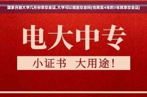 国家开放大学七月份拿毕业证。国家开放大学是中央广播电视大学,其属于教育部的部属大学也是开放性大学,不需参加全国高考就可以上,是想提升自己学历的一种途径,国家承认其学历,大专及同等学历的可以参加本科学历的学习。中专及中等职业学历的可以参加大专学历的学习。