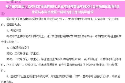 而且现在有很多用人单位在你去面试的时候都会问你本科是哪所大学毕业的,研究生代表着你的学习能力强,代表着你就业的范围可能比较广,但是本科学历毕竟是你四年在校学习出来的成果,还有一点是现在很多的,通过成人高考,还有电大的本科生,也有考研究生的人,如果说他们不是全日制的,而你是全日制的相对来说你肯定就会比他们占据优势,如果说你没有本科毕业证,怎么证明你是全日制的学生呢?所以说不管你是考研还是考博,本科毕业证都很重要。