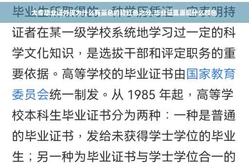 教育部门为了区别毕业证的种类(即你受的高等教育的类别),才有了蓝色的和红色外皮之分,四年制在校学习毕业为红色(就是参加普通高考正规录取的国家普通高校应届毕业),其余的什么函授、夜大之类毕业的都是蓝色。
