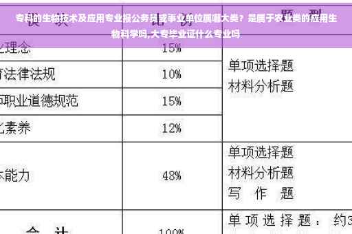 追问: 一般招聘生物技术及应用专业的单位几乎没有,但有些职位是直接招大类的,如果这个专业属于生物类的,那就只能报专业不限,因为生物类的基本都是研究生以上,如果是属于农业类的,专科还有希望,我就是想确认一下具体是什么类别,如果是生物类的我就前途渺茫了 回答: 其实你专业是一个边缘专业,本身属生物类,如果从专业性质来说,也算属农业类,因为你是学应用的,我建议你想考试哪个岗位就去报,能报则报,不能就是花了一点去报名的时间,不要错过报名时间。