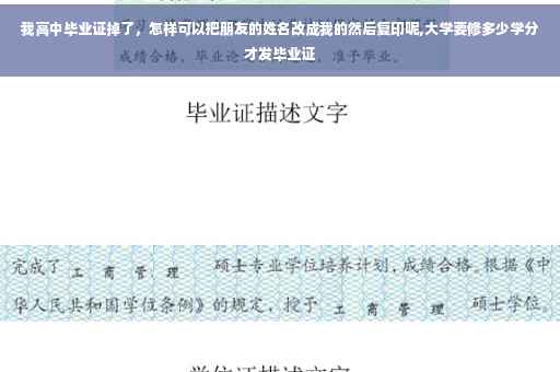 高中毕业证掉了,最好不要把朋友的姓名改成自己的, 高中毕业证书由省教育厅统一管理,省、市两级教育主管部门审查、验印,毕业证书一律于毕业当年颁发,不予补发。但教育局可以办理基础教育学校毕业证书遗失证明,具体程序如下:(1)本人到原毕业学校查核毕业证书存根或出具证明;(2)本人登报声明原证遗失作废;(3)本人持证明、报纸、照片等材料到市教育局基础教育科申报;(4)教育局核发遗失证明。 如果只是出国留学需要,到学校开具高中毕业证明及高中三年学习成绩后,再到公证处做个公证也就可以了。