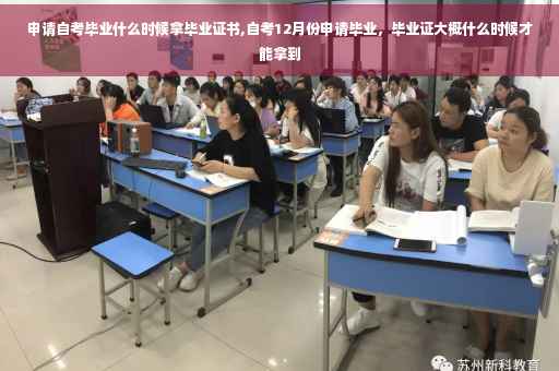 首先自考12月份申请毕业,在来年4月份左右可以领取毕业证书。自考一年有两次申请毕业的机会,分别在6月份和12月份,考生需要按照流程办理毕业申请。