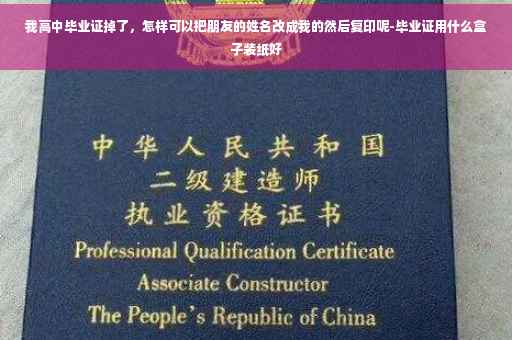 高中毕业证掉了,最好不要把朋友的姓名改成自己的, 高中毕业证书由省教育厅统一管理,省、市两级教育主管部门审查、验印,毕业证书一律于毕业当年颁发,不予补发。但教育局可以办理基础教育学校毕业证书遗失证明,具体程序如下:(1)本人到原毕业学校查核毕业证书存根或出具证明;(2)本人登报声明原证遗失作废;(3)本人持证明、报纸、照片等材料到市教育局基础教育科申报;(4)教育局核发遗失证明。 如果只是出国留学需要,到学校开具高中毕业证明及高中三年学习成绩后,再到公证处做个公证也就可以了。
