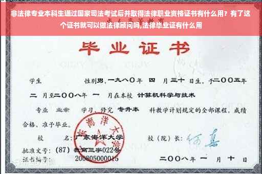 1、“非法律专业本科生通过国家司法考试后并取得法律职业资格证书有什么用?”:可以去律师事务所申请实习、一年后拿律师执业证做律师; 也可以考入检察院做检察官(还需要参加公务员考试); 也可以考入法院做法官(也需要参加公务员考试); 还可以做法律顾问。