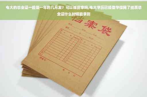 电大的毕业证一般每年七月份发放,不可以提前拿到毕业证的。电大也就是现在都国家开放大学,其学生主要通过网络授课的方式获得学分和毕业证,国家开放大学与普通高等学校的毕业时间是一样的,一般每年七月份办法毕业证,毕业证不能提前领取。