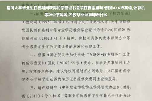大学毕业生在校期间获得的荣誉证书会,例如4\6级英语,计算机等级证书等等.这些东东是国家认证的,当然会有记录的,当然不是把证书放在里面,放不下,但是里面有你的记录:如XX年,XX以XX分通过了国家英语四级等.但是另外的一种情况,如:你在学校的演讲比赛得奖,在作文大赛里面得奖,或者就是说班上或者社团里面获得奖,如果你上报了的话,会在你的每学期的记录上获奖情况那一栏有的,如果没有上报的话就没有了.学校现在应该都有素质拓展的认证吧,上面有详细的记录.北京反正基本的学校都有!放心吧,四六级,计算机啊是有的!!!:)