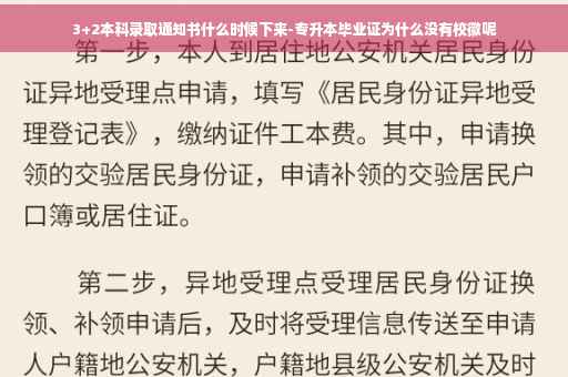 3+2本科录取通知书的发放时间为每年的7到8月份。3+2是指选拔优秀全日制普通专科应届毕业生在毕业之前三年级第二学期参加由各省教育考试院组织的统一考试(部分省份为本科校方出卷),按原专业或相关专业升入本科院校(大三)继续进行两年或三年的全日制本科教育。