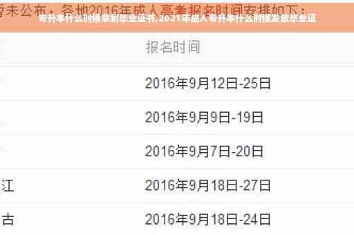 据了解,2021年成人专升本毕业证一般在学校审核确认后,由教育部门发放。具体发放时间可能会因各地政策和实际情况而有所不同,但通常会在毕业典礼后的一段时间内发放。考生可以关注所在学校和教育部门官网的相关通知,或直接咨询学校教务处了解具体情况。