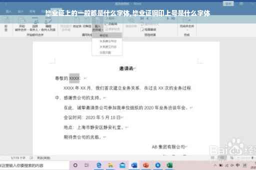 毕业证书上正文版是楷体(华文),打印部分是隶书(华文)。毕业证书基本记载项一般有姓名、性别、出生日期、毕业时间、学制、毕业专业、发证时间、证书编号、学校公章、学校钢印、校长名章等。