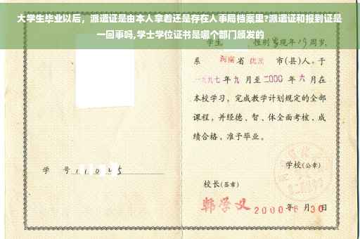 大学毕业以后,离开学校进入社会就业,所在学校会给学生一张派遣证。这张派遣证是由学生本人保存的。这张派遣证是证明你毕业了,可以去社会就业。派遣证和报到证不是一回事。报到证是学生持派遣证到人事部门,由人事部门分配你去单位上班的凭据。