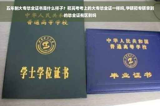 3,不同点:毕业证内容有一点区别,主要体现在学制上,高中参加高考的大专,内容里面只有“三年制专科”字样;五年制毕业证上会注明“初中起点五年制专科”字样,注意关键在于“初中起点”几个字,用人单位一看毕业证就知道是初中毕业读的五年制大专。