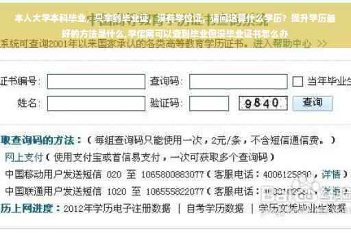 只有毕业证,没有学位证,说明大学挂科比较多,大学四年是混过去来,也没有学到什么,找工作好的单位肯定没戏,即使要你,技术方面你也胜任不了,只能作一些行政工作,找工作比较困难,除非家里有矿或家庭有背景,根据我多年的观察,往往家庭有矿区或有背景的孩子,家教都比较好,在大学混的比较少,恰恰家里没有背景的孩子混的比较多,现在到好大学里,农村家的孩都占不上百分之十,这就是中国的现状。提升学历最好的方法就是考研,大学四年都混过来,参加工作学习时间更少,还谈什么提升学历。