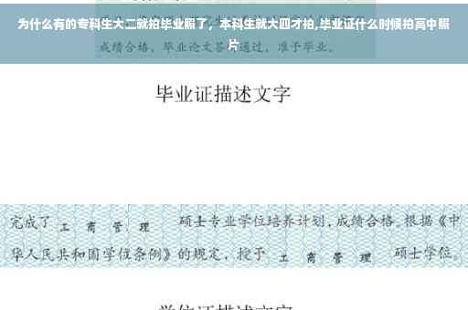 大学专科是三年制,一般情况下大三都出去实习了,即使是回到学校拿毕业证学生回来的人数都是零零散散的,所以多数专科学校都选择在大二下半学年就拍毕业照。大学本科是四年制需要在学校学习时间是三年半,都有充足的的拍照时间。拍照的时候本科生是学士学位要穿学士服的,专科没有学位证所以拍照时候不穿学士服。
