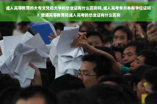 普通高考与成人高考在毕业证书上会分别注明:“普通高等教育毕业证书”和“成人高等教育毕业证书”。但普通高考和成人高考均由教育部统一下达招生计划,规定统一的学制,由省级招办组织全国统一的选拔考试、划定最低录取控制分数线及招生录取工作。毕业后均颁发经教育部电子注册的本、专科毕业证书,享受同等学历待遇。