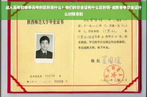 这是大家首要关心的一个问题。其实成人高考和普通高考的毕业证书是不一样的,首先成人高考的毕业证上标注有成人字样,会写上是成人高等教育,然后会写明是业余学习。并且是各大学的成教学院发的,考上了哪个大学的成教,毕业时就会盖有哪个大学的章;而普通高考的毕业证上是没有成人高等教育这个字样的,标注的就是普通高等学校,属于全日制学习,所盖的章是大学的所就读的大学的章。
