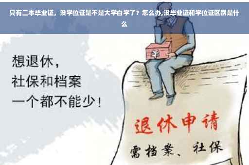 只有二本毕业证,没学位证,说明你大学的某一两门课程没有通过,没有修完所有的学分,毕业了学校只给你发毕业证,没有学位证。那么,没有学位证书,是不是大学就白读了呢?对于以后的工作生活有什么影响呢?没有获得学位证书,并不意味着你的大学就白读了,你拿到了毕业证,说明你大学的绝大部分课程都是通过了,也学到了一些知识。当然也可能是刚好压线通过,相当于混日子了。没有拿到学位证,一样是可以找工作的,学历国家承认,不需要担心。如果你是一个追求完美的人,那么没拿到学位证在某一层次上来说,确实有点遗憾。但是也不要慌,毕业了你一样是可以继续申请重修落下的课程的,一两门功课不需要留级或者留校,自己学习,到了考试时间就回校参加考试,成绩通过了,把学分补上,学校一样会给你颁发学位证书的。