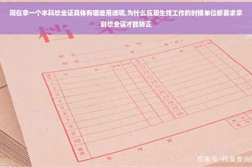毕业证等同于你所在大学对你四年在校期间的德智体美育合格的认可,相当于一份成绩单,里面是你在大学期间的各种表现,也许没有这么绝对与严肃,但倘若你毕业后连毕业证都无法拿到,至少说明你在校期间没有完全的按照校规往下发展,在一定程度上就给你的就业发展画了道线。毕竟你实习最多也就只有一年的时间,单位不能凭借着这一年对你的短暂工作表现,来确定你就是符合它标准的员工。所以,毕业证就起到了对你的整体评估作用吧。我的一个学姐在实习期间表现的非常好,实习单位的员工及领导对她都非常满意,在签约前期(即转正前期),公司要求各位实习生出示毕业证与学位证,很正常的一件事,但学姐在校3年并未好好学习,积极参加活动,导致该挂的不该挂的科都挂了,学分绩点都不够。在离校实习时幡然悔悟,但为时已晚。最后的最后,她未能如愿留下。