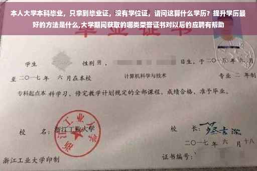 提升学历最好的方法,是考研,全日制的那种最好。根据国家政策,本科没学士学位是可以考研的。这条政策是可以在网上明确查到的。但是,各个学校有自己的细则,有些985和211在细则里排除了非学士学位的同学。
