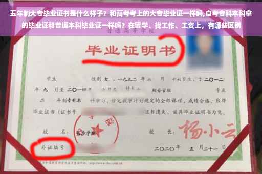 3,不同点:毕业证内容有一点区别,主要体现在学制上,高中参加高考的大专,内容里面只有“三年制专科”字样;五年制毕业证上会注明“初中起点五年制专科”字样,注意关键在于“初中起点”几个字,用人单位一看毕业证就知道是初中毕业读的五年制大专。