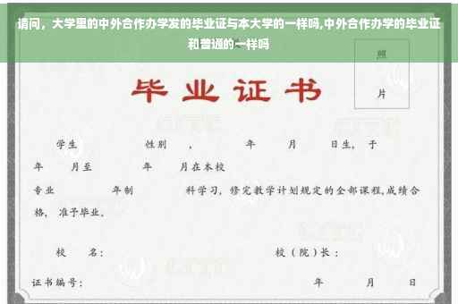 不能一概而论,有的是一样的,有的不一样的。如果是某个高校与某外国大学联合设立的独立学院那么毕业证跟本大学的毕业证不一样,比方说北京师范大学与香港浸会大学的珠海联合学院毕业证就不一样,如果不是独立学院应该是一样的,如广西大学的中外合作专业,东北财经大学的中外合作专业。