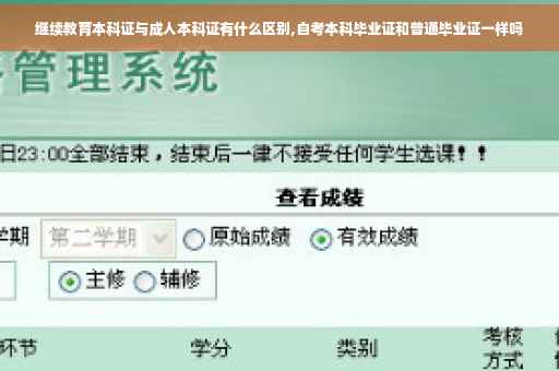 4、证书含金量。普通高考入学发放的毕业证书是会注明是“普通高等教育毕业证书”。成人高考入学的毕业证书是会注明是“成人高等教育”。含金量有区别。扩展资料:继续教育是面向学校教育之后所有社会成员特别是成人的教育活动,是终身学习体系的重要组成部分。由于世界经济社会对继续教育提出了更高的要求,继续教育实践领域不断发展,研究范畴也在不断地扩大和深入。特别是终身教育思想已经为越来越多的人所接受,对继续教育在经济、社会中的地位、作用、方法等都有一定的初步认识和实践,继续教育科学研究也有了重大发展。全日制一般指学习时间上的一种分类,顾名思义是按照国家法定工作、学习时间进行全天候学习的一种方式。全日在校学习的学校,称为全日制学校,学生全天在校上课,以教学为主。区别于业余、函授、自考等学习形式的学校。