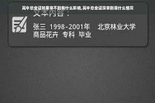 没有高中毕业证是否有影响取决于是否继续上大学。 如果继续上大学乃至读研读博,那么将来文凭就是大学本科(专科)毕业,研究生毕业或者博士生毕业,高中毕业证就用不到了,毕竟在将来就业的时候没人会在要求你拿出原来的高中毕业证,只需要有最高学历的文凭即可。 但是,如果高中毕业之后不再继续接受高等教育,那么高中毕业证就是至关重要的了,因为此时高中毕业证就是本人的最高学历证明,没有高中毕业证意味着学历就只是初中毕业,对于找工作会有很大影响。