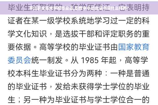 毕业生所取得的一种学历凭证。它表明持证者在某一级学校系统地学习过一定的科学文化知识,是选拔干部和评定职务的重要依据。高等学校的毕业证书由国家教育委员会统一制发。从