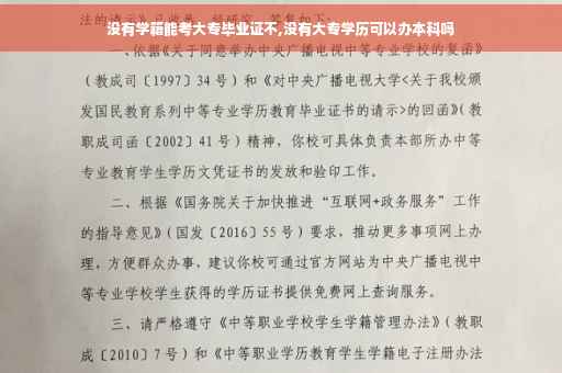 没有高中学籍、毕业证 能上大专专科一般指大学专科(高职高专)教育,是我国高等教育的重要组成部分,是大学的学历层次之一。区别于本科,大学专科教育主要由高职(高等职业技术学院)和高专(高等专科学校)承担,部分本科高校亦开设有专科。专科层次不颁发学位,毕业颁发专科毕业证书。高职和高专都属于普通高等教育的专科层次,前者偏技术,后者偏理论,侧重点不同,无本质差别。两者培养目标是统一的,在完成中等教育的基础上培养出一批具有大学知识,又有一定专业技术和技能的高级技术人员,其知识的讲授是以够用为度、实用为本,两者招生是并轨的。