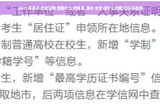 2021年高中毕业证教育局在2021年6月底。因为根据国家教育部门的规定,高三毕业生到6月底基本上离校,所以6月底毕业证就会发到毕业学生手上。高中生经过三年的学习有一部分人会考上大学,到高等学府进行深造,也有的同学会走入社会工作,建设社会主义。