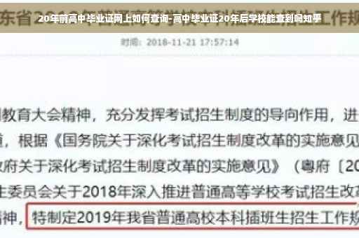 高中毕业证网上是不能查询到的,因为高中毕业证不上网,那么,20年以前的高中毕业证更不可能在网上能查到了,因为20年以前网络还不发达,对于之前的毕业证没有上,要想查20年前的高中毕业证,还需要到学生毕业所在的学校去查询,谢谢。