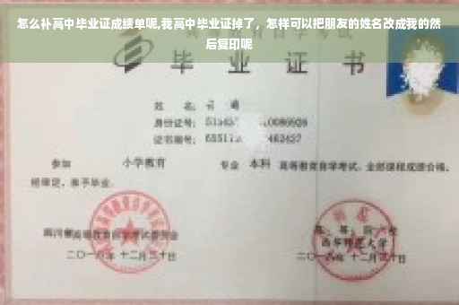 高中毕业证掉了,最好不要把朋友的姓名改成自己的, 高中毕业证书由省教育厅统一管理,省、市两级教育主管部门审查、验印,毕业证书一律于毕业当年颁发,不予补发。但教育局可以办理基础教育学校毕业证书遗失证明,具体程序如下:(1)本人到原毕业学校查核毕业证书存根或出具证明;(2)本人登报声明原证遗失作废;(3)本人持证明、报纸、照片等材料到市教育局基础教育科申报;(4)教育局核发遗失证明。 如果只是出国留学需要,到学校开具高中毕业证明及高中三年学习成绩后,再到公证处做个公证也就可以了。