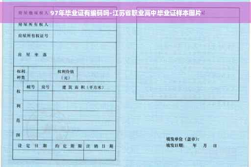 在我国,所发放的具有法律效力的证书均有编号,尤其是毕业证书。97年毕业证书同样有编码,其编码数字有年限、学校代码、专业代码、学号等几组数字组成。院校规模较小的,其毕业证编码也由年限、学籍号(含学校代码、班级序号、学号构成的)组成的。如学籍号为1101(校码)03(班级号)18(学号)的毕业证编号为9711010318。