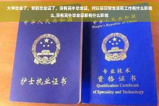 没有高中毕业证是否有影响取决于是否继续上大学。 如果继续上大学乃至读研读博,那么将来文凭就是大学本科(专科)毕业,研究生毕业或者博士生毕业,高中毕业证就用不到了,毕竟在将来就业的时候没人会在要求你拿出原来的高中毕业证,只需要有最高学历的文凭即可。 但是,如果高中毕业之后不再继续接受高等教育,那么高中毕业证就是至关重要的了,因为此时高中毕业证就是本人的最高学历证明,没有高中毕业证意味着学历就只是初中毕业,对于找工作会有很大影响。