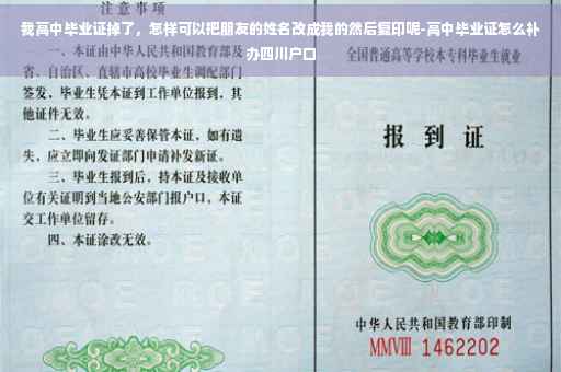 高中毕业证掉了,最好不要把朋友的姓名改成自己的, 高中毕业证书由省教育厅统一管理,省、市两级教育主管部门审查、验印,毕业证书一律于毕业当年颁发,不予补发。但教育局可以办理基础教育学校毕业证书遗失证明,具体程序如下:(1)本人到原毕业学校查核毕业证书存根或出具证明;(2)本人登报声明原证遗失作废;(3)本人持证明、报纸、照片等材料到市教育局基础教育科申报;(4)教育局核发遗失证明。 如果只是出国留学需要,到学校开具高中毕业证明及高中三年学习成绩后,再到公证处做个公证也就可以了。