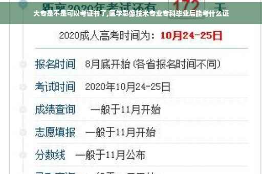 刚毕业如果想考专升本的话可以考成人本科,成人本科考上后的接下来第二年需要考学位英语,然后工作两年后单位有要求的话需要考相应职业的大型医用设备上岗证,技士证拿到手之后的第二年可以参加技师考试,之后的考试就比较少了,除了晋升职称,别的考试就不多了。