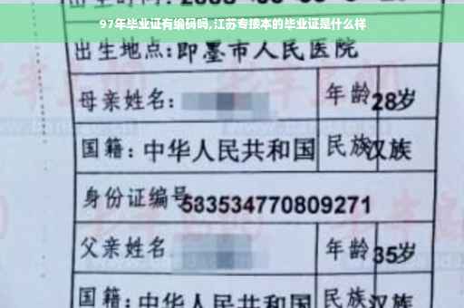 在我国,所发放的具有法律效力的证书均有编号,尤其是毕业证书。97年毕业证书同样有编码,其编码数字有年限、学校代码、专业代码、学号等几组数字组成。院校规模较小的,其毕业证编码也由年限、学籍号(含学校代码、班级序号、学号构成的)组成的。如学籍号为1101(校码)03(班级号)18(学号)的毕业证编号为9711010318。