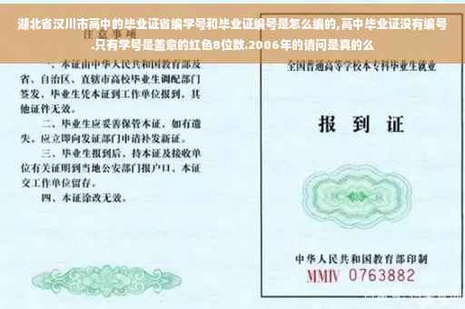 正规的普通高中毕业证(例如:湖北省教育厅统一印制):左半页上方贴有毕业生本人半身免冠二寸照片、下方填写有毕业证书编号(或学籍号+身份证号)和查询网址(湖北教育信息网);右半页上方填写姓名、性别、籍贯、高中学习起止时间,下方盖有校长印章和学校公章,落款是毕业证发放时间(如:二〇〇六年6月30日),在照片右下角压有地市级教育局钢印。【说明】各省市高中毕业证试样不一定一样,建议你到发证学校或学校上级主管教育局查询该生学籍和毕业证存档信息,即可确定真假。学号:2000123456(共10位数 前面是年号 后面是学号)
