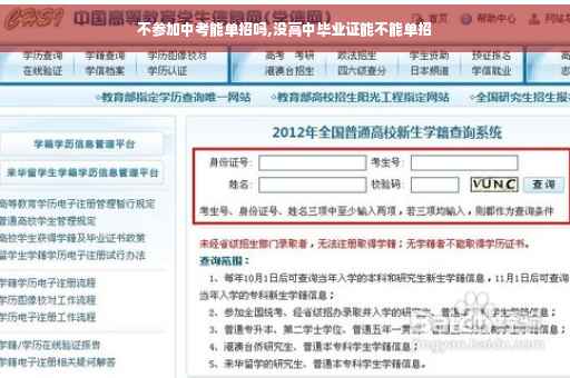 单招主要指的是大学专科单独招生计划,招收对象为中等学历教育毕业生,为升学招生。根据国家相关升学招生管理规定,未取得F一级毕业证书或同等学力证书者,没有资格报考上一级学校,如有特殊情况,可具体问题个别处理。