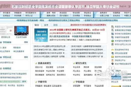 石家庄财经职业学院的前身为创办于1999年的石家庄知行专修学院。2001年1月经河北省人民政府批准,更名为石家庄北方专修学院。2002年5月经河北省人民政府批准,教育部审核备案,更名为石家庄外经贸职业学院,正式纳入国家统招计划。2011年1月,经河北省人民政府批准,教育部审核备案,更名为石家庄财经职业学院。石家庄财经职业学院具备独立颁发国家承认学历证书的资格。原来是红色的,从2005届起就改用蓝色了,并且和内心完全分离;毕业证内心也增强了防伪技术(主要是防止制假)。2000年以后的大学毕业证书都可以在中国高等学校学生信息网上查询真伪,封面和内芯完全分离,用什么颜色的封面对毕业证真假没有影响,关键是内芯,只要内芯是真的,在上述网站上查得到就行。封面都是中华人民共和国教育部监制的,并印有“中华人民共和国教育部监制”字样。; 本科三批(独立院校)和私立大学的,他们的毕业证封面是蓝色的。;