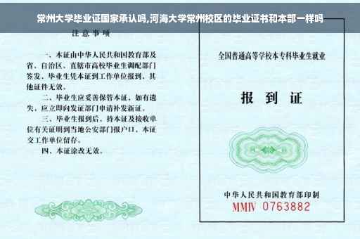 河海大学常州校区的毕业证与河海本部的毕业证没有区别。 因为河海大学常州校区是河海大学的分校,分校生的本科毕业证书由总校统一颁发,证书的封皮样式与文字与总校一模一样,发的都是河海大学的毕业证,没有常州校区字样。