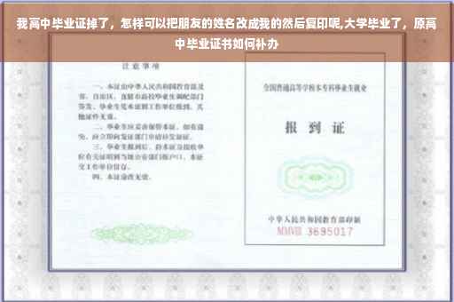 高中毕业证掉了,最好不要把朋友的姓名改成自己的, 高中毕业证书由省教育厅统一管理,省、市两级教育主管部门审查、验印,毕业证书一律于毕业当年颁发,不予补发。但教育局可以办理基础教育学校毕业证书遗失证明,具体程序如下:(1)本人到原毕业学校查核毕业证书存根或出具证明;(2)本人登报声明原证遗失作废;(3)本人持证明、报纸、照片等材料到市教育局基础教育科申报;(4)教育局核发遗失证明。 如果只是出国留学需要,到学校开具高中毕业证明及高中三年学习成绩后,再到公证处做个公证也就可以了。