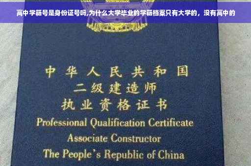 高中学籍号是身份证号的。学籍号是从小学一年级开始就有学籍,学籍号就是你的身份证号码的。一个学生只有一个学籍,学籍是学生的名片,没有学籍就上不了学。现在的学籍是智能化管理,第一次没有出错一般是不会错的。但愿我的建议对你有帮助。