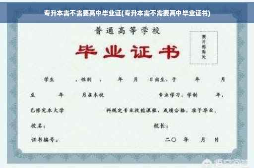 专升本即专升本考试,是大学专科(高职高专)学生进入本科学习的选拔考试的简称,是中国教育体制大专层次学生升入本科院校的考试制度。其主要有两大类型: 第一类是普通高等教育专升本(普通高校全日制统招专升本),选拔各省当年应届普通高校全日制(统招入学)的专科毕业生; 第二类是成人教育大类专升本。四种途径,包括自考专升本、成人高考专升本(业余,函授)、远程教育(网络教育)专升本、广播电视大学开放教育专升本。改革开放以来,中国的高等教育蓬勃发展,现在全国已积累了成百上千万大专毕业生,随着社会主义现代化进程的加快,社会对高层次人才的需求不断增长,有些用人部门对员工提出了限期达到本科层次的要求,越来越多的专科毕业生要求提高学历层次。你好·专升本不需要你的高中毕业证,但是需要你的专科毕业证·当然前提是你的专科毕业证是真实学信网可查的学历。另外,没有专科学历,那么可以选择专本套读,在弄大专学历的同时,进行自考本科学历。三年时间可以拿到大专和本科学历。所选专业可以跨专业报考。希望能够帮助到你